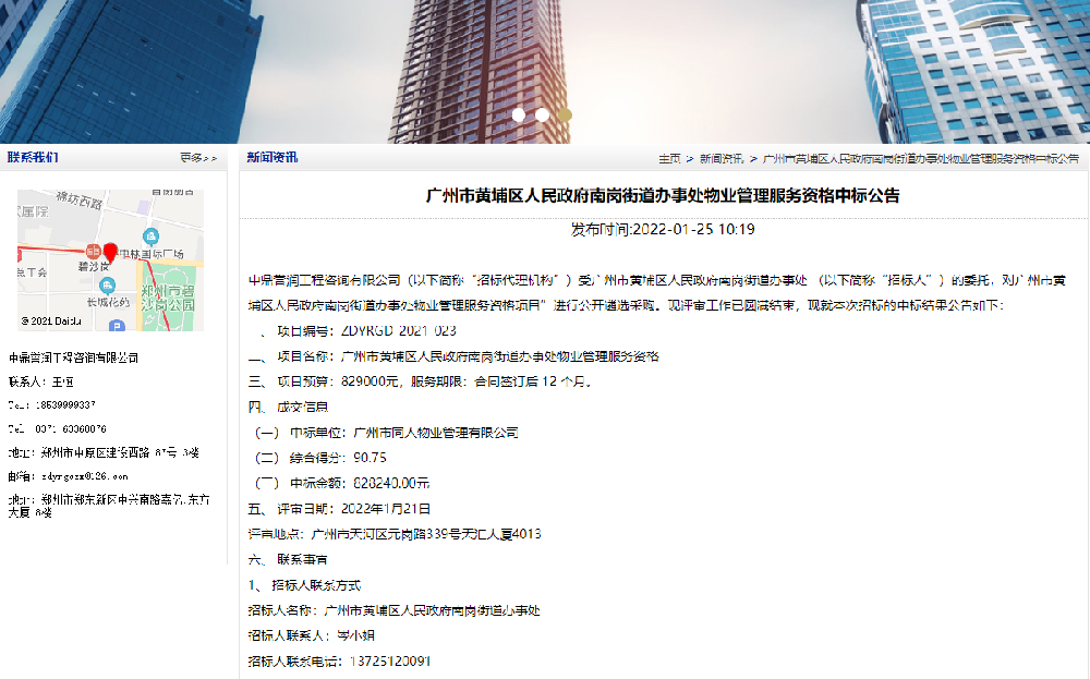 鼎點(diǎn)娛樂工程咨詢有限公司(以下簡稱“招標(biāo)代理機(jī)構(gòu)”)受廣州市黃埔區(qū)人民政府南崗街道辦事處 (以下簡稱“招標(biāo)人”)的委托,對廣州市黃埔區(qū)人民政府南崗街道辦事處物業(yè)管理服務(wù)資格項(xiàng)目”進(jìn)行公開遴選采購。現(xiàn)評審工作已圓滿結(jié)束,現(xiàn)就本次招標(biāo)的中標(biāo)結(jié)果公告如下:一、項(xiàng)目編號:ZDYRGD-2021-023二、項(xiàng)目名[詳細(xì)]